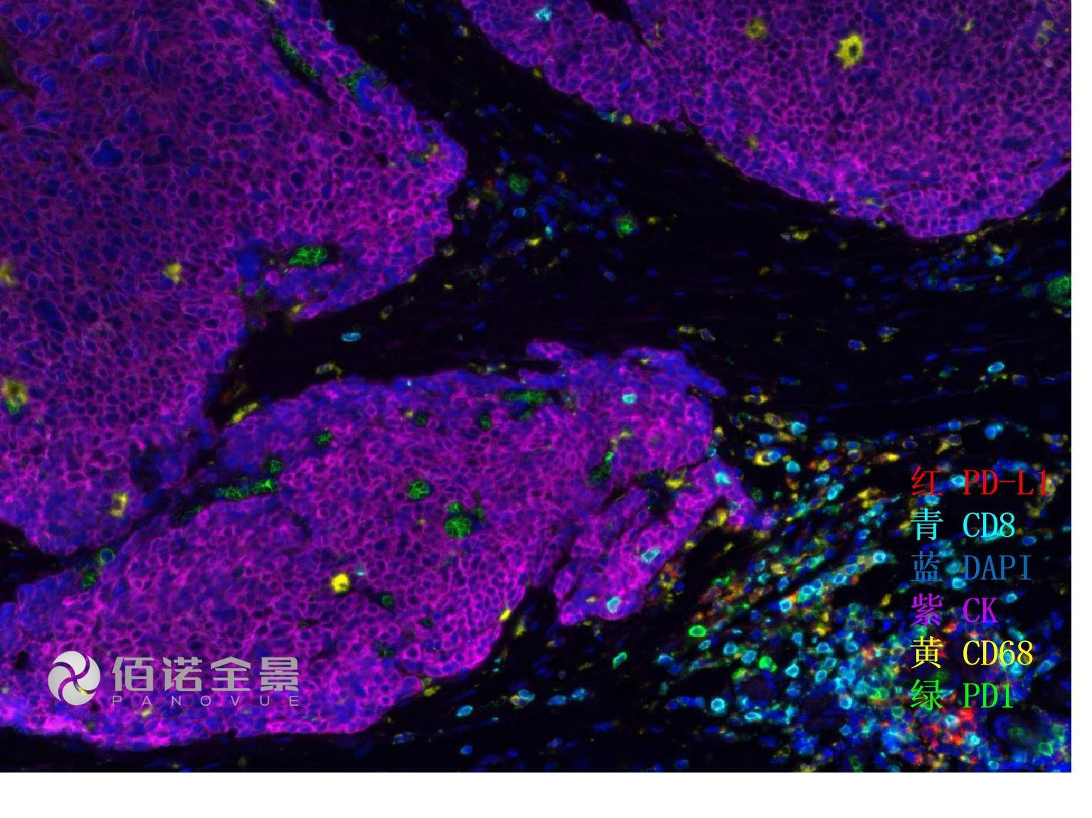 通过组织多色免疫荧光原位标记、多通道叠加信号识别、多指标形态定量分析三个环节的技术突破,在一张组织切片上原位检测多种生物标记物的表达水平(n≥5),借以识别组织上每个细胞的表型类别、功能状态及其相互关系,并给出具有统计学意义的细胞组学数据。该方法非常适合全面描绘复杂的组织微环境信息,称之为组织微环境全景分析技术(Tissue Microenvironment Landscape Analysis)。