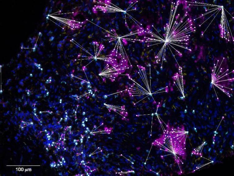 随着空间转录组大热,组织空间分析也备受重视,其也被称为邻近度分析、细胞关系分析,此处特指对组织切片进行多靶点标记染色(即多重免疫组化染色)、成像,随后进行组织的拆分和细胞表型的识别,在此基础上计算不同细胞之间的空间关系,进而对细胞之间的相互作用做出推测。也可以分析划定组织交界面两侧的细胞密度,进而分析细胞的浸润程度。